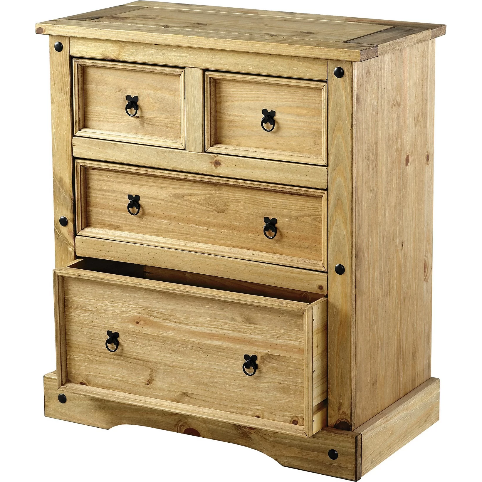 Rustic Pine finish with black metal handles and studs and rustic pine tops. All drawers dovetail finish