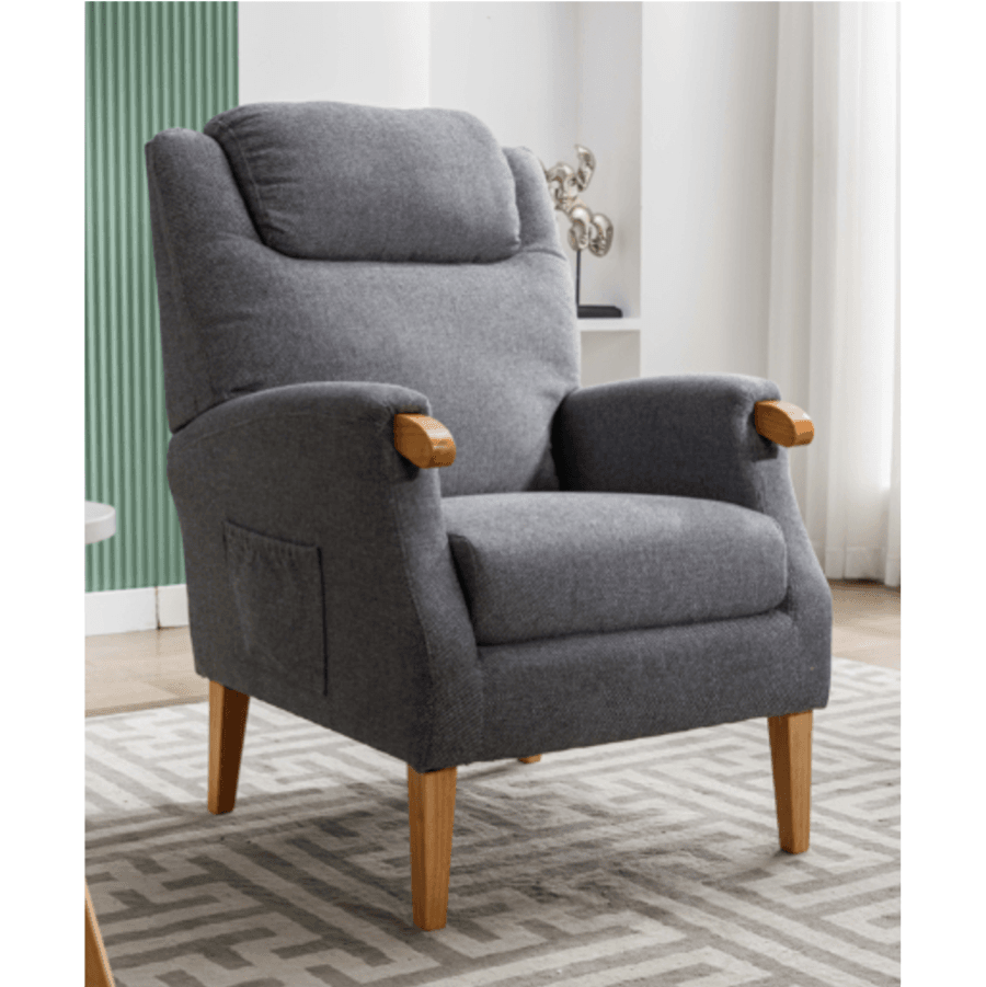 TRADITIONAL STYLING HIGH RISE BACK FOR NECK SUPPORT & COMFORT, OAK FRAME WITH HANDY SIDE POCKET DETAIL. FINISHED IN GREY FABRIC